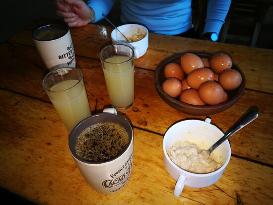 Zum krönenden Abschluss wurden wir, kurz vor 9 wieder am Camp, mit einem Frühstück für Helden empfangen - frischem Kaffee, Toast, Käse, Müsli, Eier. Endlich Eier!