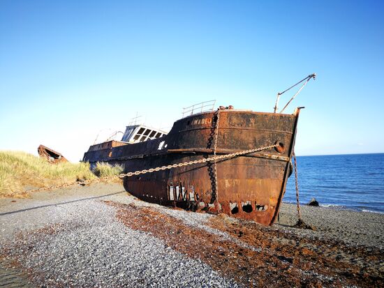 Hier eines der Opfer dieser stürmischen Meerenge - Sie sehen das Wrack der AMADEO im roten Abendlichte von San Gregorio.