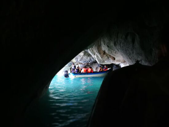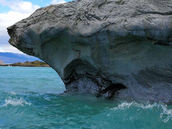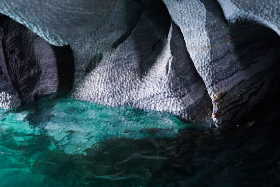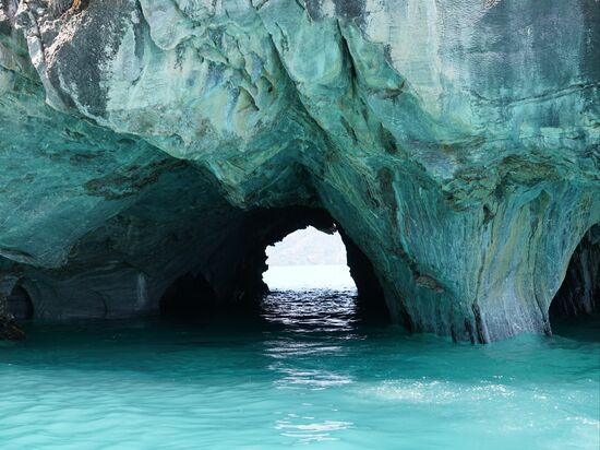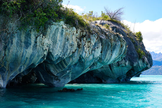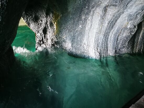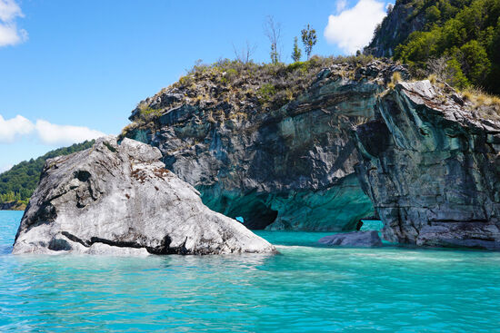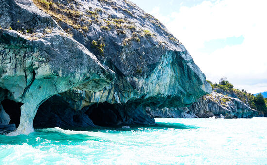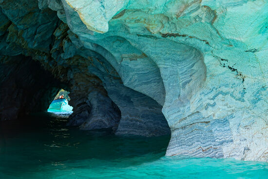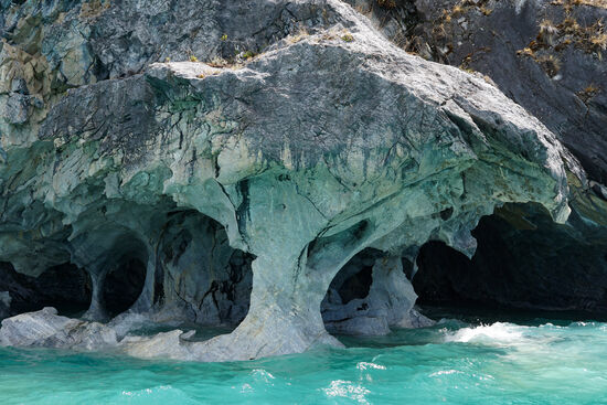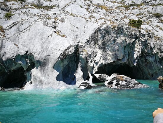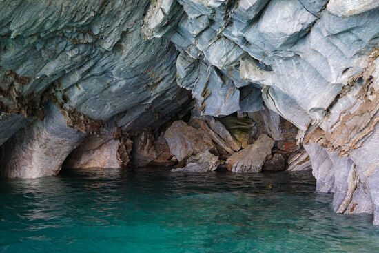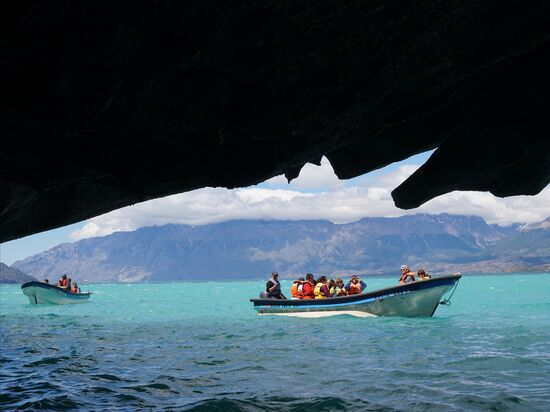 Die vom wilden Wasser des Lagos ausgewaschenen Marmorhöhlen sind ausschließlich auf dem Seeweg erreichbar und die beiden kleinen Motorboote schaukelten mit jeweils rund 25 Passagieren bereits in der Uferbucht nicht schlecht.