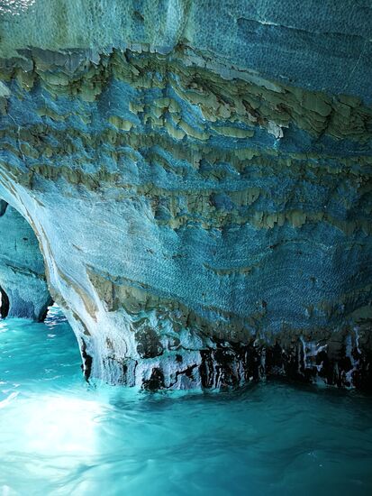 Das sich in den Höhlenwänden spiegelnde, glasklar-türkise Gletscherwasser des Lago sowie Pflanzen- und Mineralienablagerungen ließen das Gestein dazu prächtig in allen Türkis-, Blau- und Silbertönen schimmern.