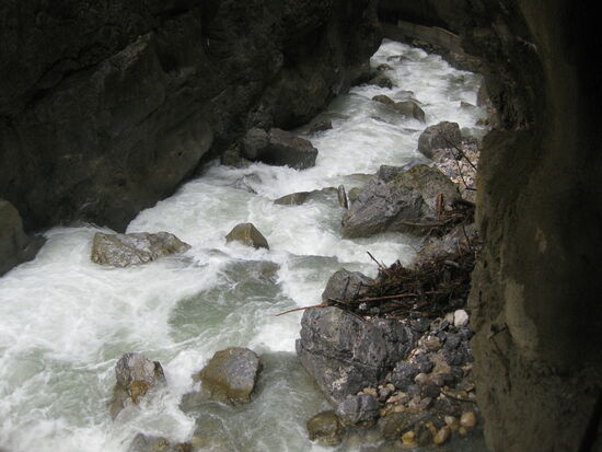 Wie gesagt, der Weg durch die Partnachklamm ist eng.. Felsen im Wasser bilden Stromschnellen, an manchen Stellen fließt die Partnach in Treppenstufen zwischen Felsbrocken hinunter. Die Partnach ist der natürliche Abfluss des Schneeferners, dem Rest eines eiszeitlichen Gletschers auf dem Zugspitzplatt. Im Laufe der Jahrtausende brach die Partnach durch die Gesteinsschichten, und so entstand die heutige Klamm