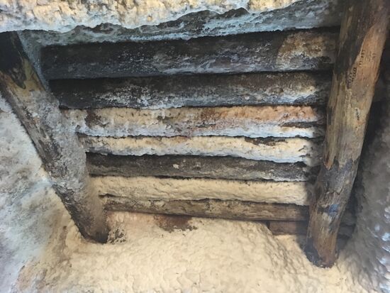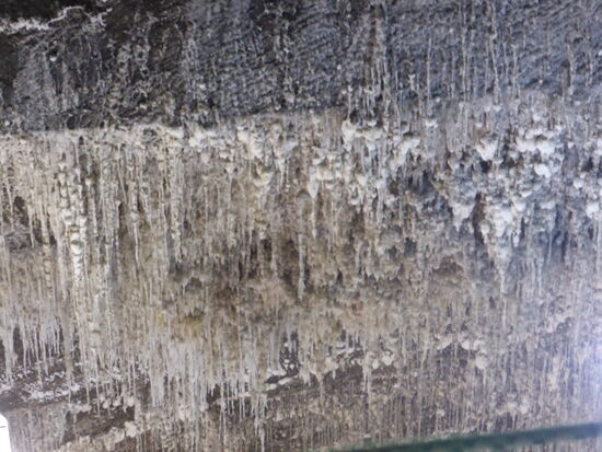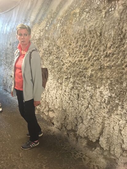 Über zahlreiche Stufen geht es zunächst hinab und dann durch einen langen Gang; an den Wänden bildet das Salz Ausblühungen. .