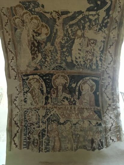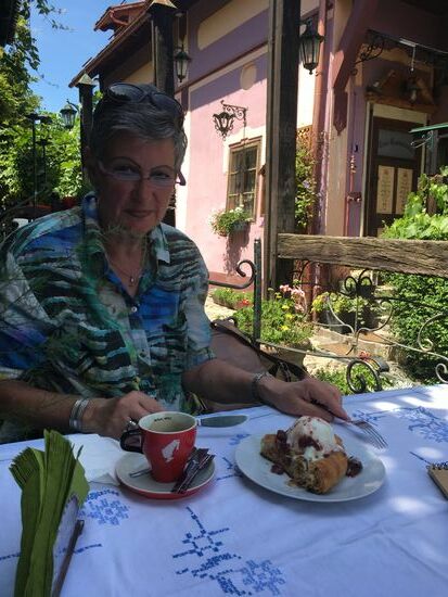 Es ist wieder höllisch heiß und uns gelüstet es nach einem Kaffee, den wir diesmal in einem tollen Café einnehmen. Wie Christa auf meine Mail hin bemerkt, sitzen wir schattig in leichtem Wind bei einer handgestickten Decke. Ulrike möchte den Strudel und bekommt eine Portion, von der wir beide gesättigt sind. Wir haben das nicht bemerkt!
