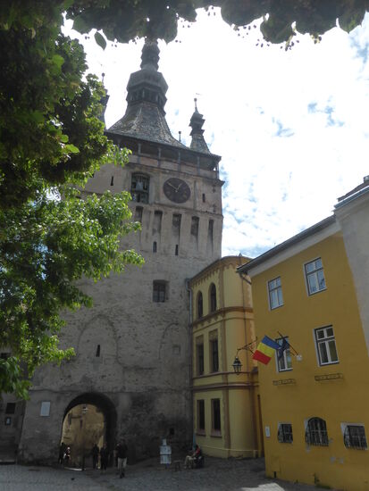 Ein wenig unterhalb des Cafés sind wir wieder am Vlad-Dracul-Haus, d.h. auf dem Platz Muzuelui. Hier befindet sich auch der Turnul cu Ceasului - Stundenturm/Stundturm. Als ehemaliger Torturm der mittelalterlichen Befestigung ist er auch heute noch der Haupteingang zur Oberstadt. Nach einem Brand ersetzte ein Neubau von 1677 den Vorgänger aus dem 14, Jahrhundert. Jahrhundertelang war in ihm das städtische Rathaus untergebracht.