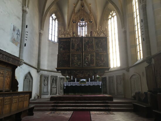 Der Stolz der Kirche ist der gotische Flügelaltar von 1490. Während des Bildersturmes der Reformation waren die Reliefs der zwei schwenkbaren Schreintüren und die hölzernen gefassten Vollplastiken entfernt worden. Ein Teil der Skulpturen wurde 1992 durch die Auferstehungsgruppe des Wiener Künstlers A. Pichler ersetzt. Die Werktagsseite {geschlossene Flügel) zeigt auf acht Altarbildern die Passion Christi.