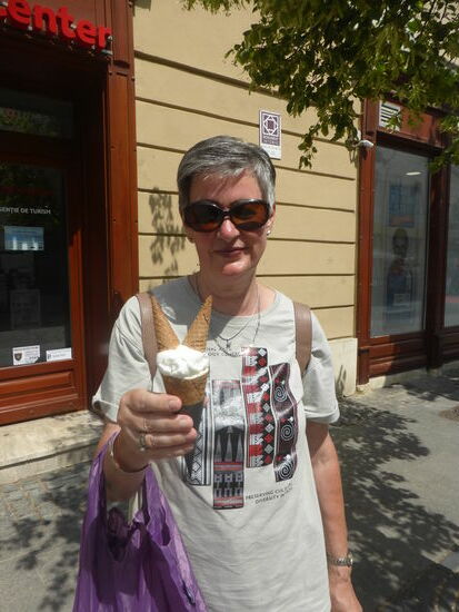 Danach gelüstet es Ulrike nach einem Eis, diesmal sogar mit zwei Kugeln, die mit zwei Minihörnchen verziert werden. Am großen Platz gibt es wieder etwas Spezielles: Langos – sieht aus wie Pizza ist aber eigentlich nur mit Käse bestreut