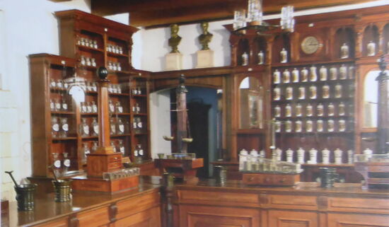 Das Mobiliar dieses Raums wurde 1902 in Wien hergestellt und gehörte ursprünglich zur Hermannstädter Apotheke 'Zum schwarzen Adler' .