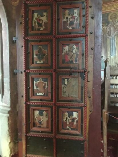 Die Innenmalereien wurden in zwei Phasen gefertigt. Der Altarraum, der Gemeinderaum (Naos) und die Vorhalle (Pronaos) wurden im Jahre 1496 bemalt,