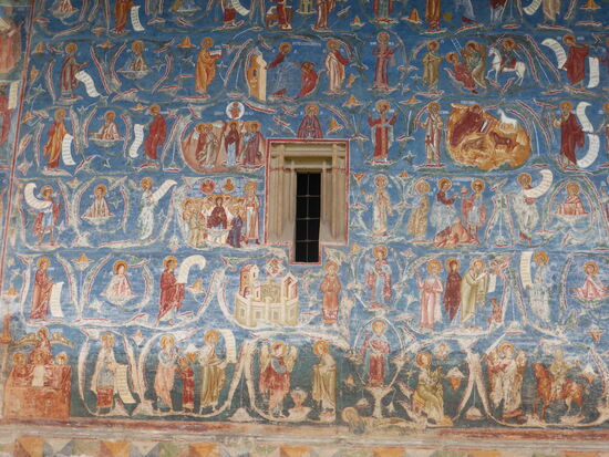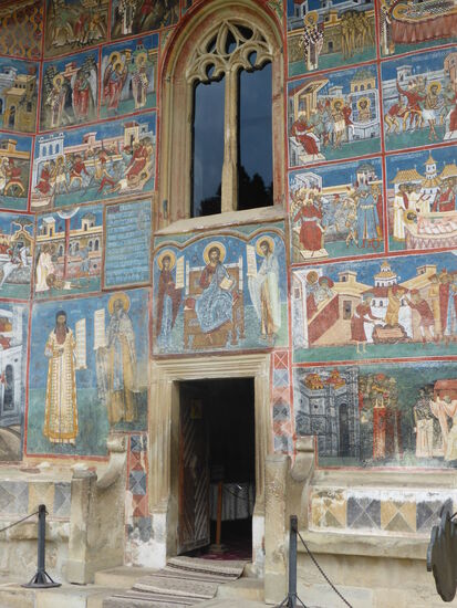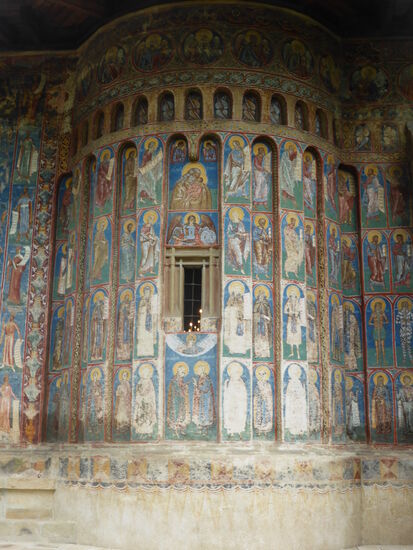 Beschreibung: Die Kirche des Klosters Voronet ist dem Heiligen Großmärtyrer Georg gewidmet. Sie wurde zwischen dem 26.Mai und dem 14.September 1488 gebaut und hat eine für den moldawischen Stil repräsentative Baugestaltung. Die Entstehungssage des Klosters führt auf zwei große Persönlichkeiten zurück: der Heilige Fürst Stefan der Große, Stifter des Klosters, und der Heilige Einsiedler Daniel. (Infotafel)