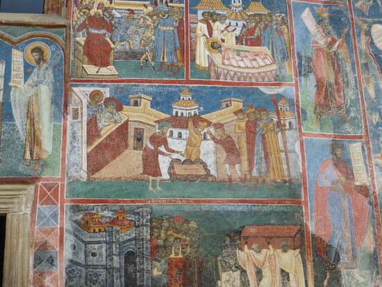 Auf der Nordfassade, welche von der Witterung sehr beschädigt wurde, blieben einige Szenen des „Lobgesangs zu Ehren der Jungfrau Maria", der „Schöpfung", des „Lebens Antonius des Großen" und der „Himmelszölle" erhalten. Die Westfassade ist eine riesige Ikone des „Jüngsten Gerichts". Diese Darstellung ist einzigartig im ganzen Christlichen Osten. s.o.