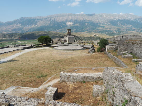 Oben angekommen beeindruckt die tolle Lage der Stadt inmitten der Berge: Die albanische Version der Toskana!