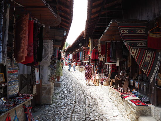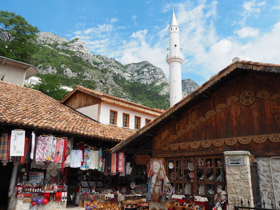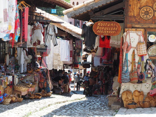 Nachdem der Wagen schließlich doch noch in einem Stück an einem passenden Parkplatz ankommt, laufen wir zunächst durch den Basar. Optisch ist er fantastisch und teilweise werden auch interessante Stücke - z.B. aus der kommunistischen Zeit - angeboten. Jedoch gibt Kruja meines Erachtens einen Ausblick auf das Albanien, wie es in 10 Jahren aussehen könnte. Von allen Seiten hört man: "Come inside", "You can look in the shop", "Coffee, tea, beer!", "Where are you from?", usw. Sicher alles lieb gemeint, aber ein bisschen too much. Ich weiß schon selbst, ob ich irgendwo hineingehen möchte oder nicht, danke.