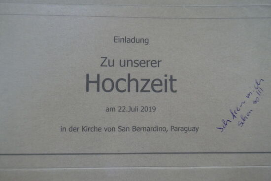 Etwas ratlos blieb ich zurück. Hatte ich das jetzt grad richtig gelesen? Kann ich mir eine solche zusätzliche Reise leisten? Beruflich, finanziell und überhaupt? Die Entscheidung war schnell getroffen: eine Hochzeit kann ich mir natürlich nicht entgehen lassen und an diesem grossen Tag möchte ich meine Freundin gern begleiten. Meine Reisepläne hatten sich schlagartig um eine grössere Reise nach Südamerika erweitert. Inzwischen ist auch die schriftliche Einladung per eleganter Hochzeitsanzeige in meinem Briefkasten eingetroffen.