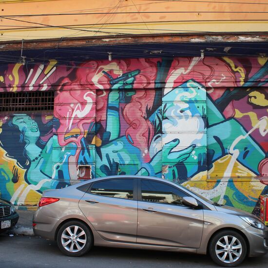 Doch jetzt ist es Zeit für einen Spaziergang durch die Stadt. Ich will sehen, ob ich so etwas wie das Zentrum finde. Das erweist sich allerdings als schwierig, denn die Stadt erfüllt meine Vorstellung von Altstadt oder erkennbarem Zentrum überhaupt nicht. Ich gehe entlang der Estrella-Strasse, an der ich gestern die fantastischen Wandgemälde entdeckt hatte.  Fast die ganze Strasse ist voll davon. All die Läden, die jetzt noch mit einer Store geschlossen sind, sind übermalt. Wenn der Laden dann aufgeht, sind die meisten Sujets nicht mehr sichtbar.