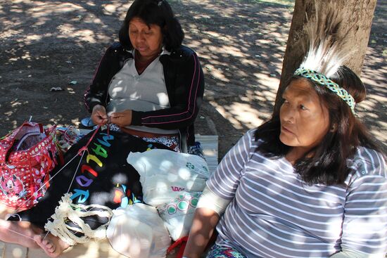 Auf der anderen Seite des Parkes sitzen ältere Frauen. Sie sitzen am Boden und machen Handarbeiten, die sie verkaufen. Freundschaftsbändel aus bunten Garnen. Um das Garn aufzuspannen machen sie es an ihren grossen Zehen fest. Das habe ich überhaupt noch nie gesehen. Ich versuche ein Gespräch, komme aber nicht richtig vorwärts. Es scheint, dass sie nicht viel Spanisch sprechen.