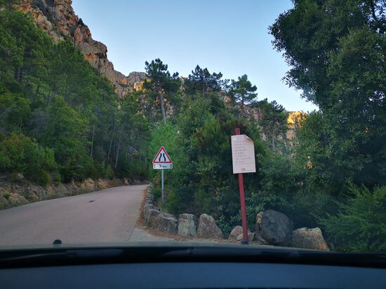 Und schon beginnt die kurze Strecke (ca. 10 km) durch die Calanche. Auf dem kleinen Schild links steht übrigens: "camping interdit" (campen verboten)