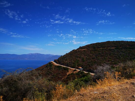 Ein weiterer Abstecher zum Meer bringt mich nach Marina di Pevani und von hier aus eine winzige Straße mit herrlichen Ausblicken auf die Küste. Zunächst ist die Straße gut geteert und wunderschöne Anwesen gibt es hier. Dann ist Schluss mit dem guten Asphalt für gut betuchte Anwohner Ich muss mich zwingen, nicht zu oft Richtung Küste zu schauen, sondern öfter mal auf die Straße. Hier gibt es Schlaglöcher, die man besser umfahren sollte. Die heutige Fahrübung: Geschicklichkeitsfahren.