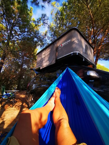 und direkt gegenüber nächtigt jemand in einem Dachzelt - die Leiter lehnt noch am Auto, eine Leine mit Wäsche ist zwischen die Bäume gespannt. Der oder die hat Nerven! Immerhin könnte so eine Übernachtung dann noch teurer werden als 25 € :-/
