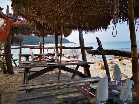 Unten angekommen: ein Traum von Romantik: eine wunderschöne kleine Bucht und dieses Restaurant, zwar einfach aber mit vielen Details dekoriert - leider bin ich zur falschen Zeit am richtigen Ort... 11 h. nix Essenszeit