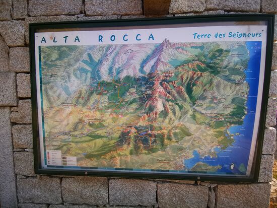 Ich verabschiede mich von Harald und fahre Richtung Zonza durch das Gebiet Alta Rocca, eine hügelige Landschaft mit Kiefern-, Kastanien- und Eichenwäldern. Es gibt hier viele pittoreske, hoch liegende Dörfer, wie z. B, St. Lucie de Tallano (454 Einwohner).