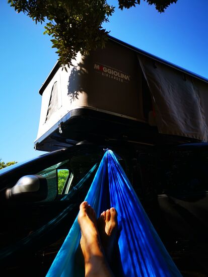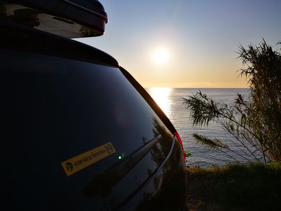 Es geht wieder gut los: mein Navi lotst mich zum Campingplatz über Straßen, die sowohl vom Untergrund als auch von der seitlichen Bewachsung nicht wirklich als solche identifiziert werden können. Und später sehe ich, dass ich mich nun wohl so langsam aufhören muss, jeden neuen Kratzer zu beweinen. Dieses Mal hat es die Dachbox erwischt. Das wird sich wohl hier auf Korsika auch nicht vermeiden lassen, wenn ich ein wenig abseits fahren möchte :-/