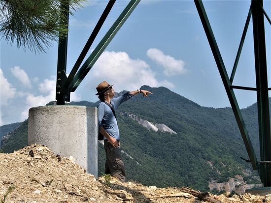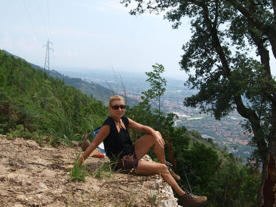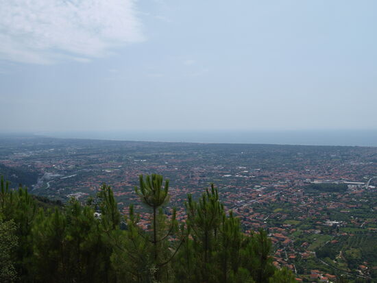 Den bekommen wir. Er ist so spektakulär, dass die Mühen vergessen sind. Wir befinden uns auf dem „Weg der gotischen Linie“, wie uns ein Schild verrät. Vor uns breitet sich das dem Meer vorgelagerte Land aus, und wir haben das Gefühl, trotz des diesigen Himmels die gesamte Küste der Toskana von den Inseln bis zum Hafen von Carrara und darüber hinaus bis nach Ligurien überblicken zu können. Wahnsinn! Die Sonne brennt, doch es weht immer wieder einmal ein kühles Lüftchen von woher auch immer. Es ist überraschend laut – von unten ist Verkehrs-, Bau- und Marmorverarbeitungslärm zu hören, in den sich das Bellen von Hunden und das Krähen von Hähnen mischt. Es riecht aromatisch nach Myrthe, und die mit Pyrit durchsetzten Steine schimmern silbern und golden im Sonnenlicht.