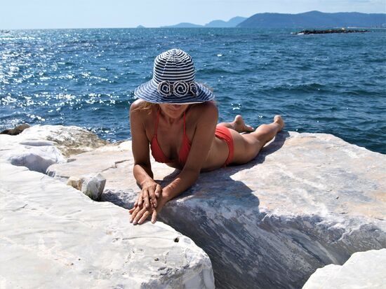 Und das wird belohnt: Das Auto steht kühl für kostenlose zwei Stunden in einem Parkhaus direkt am Markt, ich kann meinen Vorrat an Haarkämmen wieder aufstocken und finde natürlich Oberteile und Röcke für insgesamt 5 Euro, und hernach haben wir auch gleich einen Parkplatz direkt vor der Felsenmole. Ein leichter Wind geht, es ist nicht überfüllt, und wir haben viel Spaß mit der einheimischen Bevölkerung, als eine Signora mit Sonnenbrille ins Wasser springt. Sie nimmt es mit Humor, wir alle helfen suchen, und als ein Held sie aus der Tiefe befördert, applaudieren alle: „Bravissimo!“