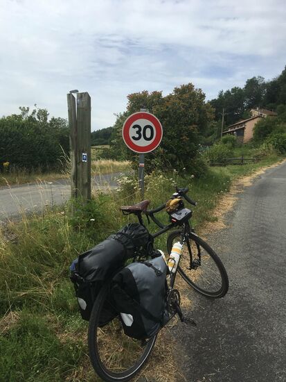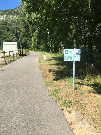 Der Weg ist auf weiten Abschnitten sehr gut befahrbar und an jeder Kreuzung stehen Wegweiser mit ViaRhône und Jakobsmuschel. Es wird wärmer und wärmer, die Temperaturen liegen nun bei Mitte 30 Grad. Mein Kopf hängt nach unten über dem Lenker. Ich muss an die Sonnenblumen denken, die in der Hitze auch ihre Kraft einbüßen und nicht mehr in voller Größe stehen.