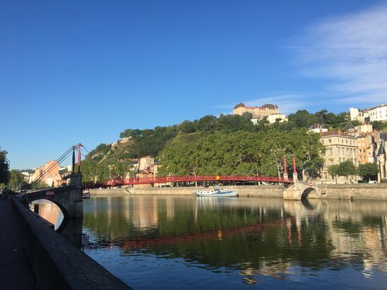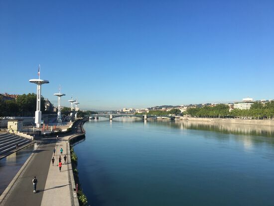 In Tramayes trennen sich unsere Wege. Sie fährt weiter die Berge hinauf, für mich geht es talabwärts Richtung Saône. Der Abschied fällt mir nicht leicht, doch so ist das eben auf Reisen und man sieht sich ja bekanntlich immer zweimal im Leben. Nun bin ich wieder mit meinen Gedanken und Eindrücken beschäftigt. Von der Höhe beobachte ich das zerklüftete Muster der Landschaft aus Grün- und Ockertönen. Um Chénas ziehen sich die weitläufigen Weinanbaugebiete als Teil der Beaujolais durch die Natur. Danach erstrecken sich auch schon die Vororte Lyons und ziehen mich in den Sog der drittgrößten Stadt Frankreichs. Überall entlang des Flusses sitzen Angler und scheinen die Ruhe sichtlich zu genießen. Doch ich bin lieber auf dem Rad und sammle die Eindrücke von Land und Leuten.