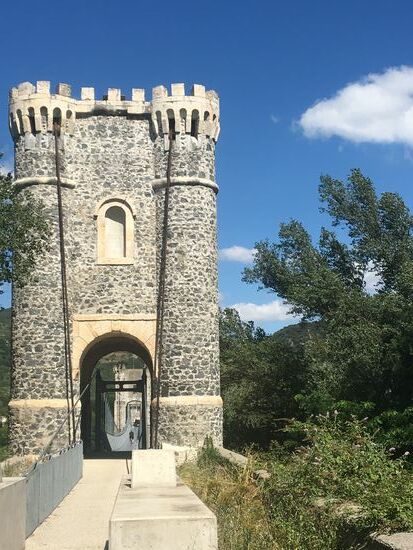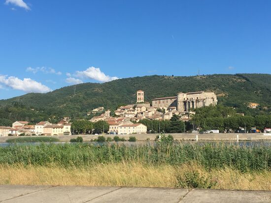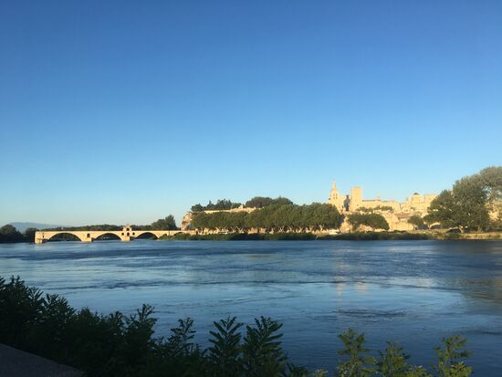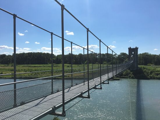 Wieder fahre ich einen Tag mit W. bis nach Avignon. Vom Rückenwind getragen stacheln wir zwei Männer uns an und radeln die Strecke bis in die Provence fast in Windeseile. Die Landschaft ist reizvoll, immer mehr Anbaugebiete von Aprikosen, Feigen, Kirschen, Pfirsichen und Birnen durchqueren wir. Eine Wohltat ist es, wenn man ein paar Tropfen der Sprühanlagen der Felder beim Fahren erwischt, die einen für ein paar Minuten etwas abkühlen. Im Gegenzug gibt es immer wieder längere Passagen ohne Schatten. Dann geht es nur darum auf staubtrockenen Radwegen die abzustrampeln. Die Hitze flimmert über dem Asphalt und ich muss mich auf den Weg konzentrieren. In diesem Moment kann ich die mich umgebende Schönheit nicht wirklich wahrnehmen. Doch das kontinuierliche Zirpen der Zikaden holt mich immer wieder in die Gegenwart zurück und verleiht der ganzen Atmosphäre etwas weitaus südländischeres. Unterwegs queren wir die Passerelle Himalayenne bei Rochemaure, eine beeindruckende modernisierte Hängebrücke.