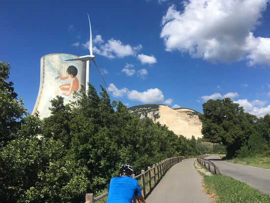 Auf einem hübschen kleinen Campingplatz bei Charmes-sur-Rhône lassen wir den Freitagabend unter Begleitung von Livemusik und Bier gemütlich ausklingen. Ein Teilnehmer der Sun-Trip-Challenge fällt dort direkt mit seinem modifizierten e-Reiserad auf. Nachdem er die 1.200 km der diesjährigen Tour zurückgelegt hat, möchte er bis nach China weiter mit Unterstützung seiner Solarmodule fahren. Ich hoffe, dass er möglichst viele Sonnentage erwischt.
