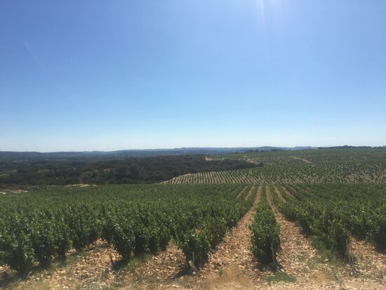 Bei Caderousse verlassen wir das Wasser und fahren wieder langsam bergauf. Die Hügel bei Montredon und Roquemaure offenbaren uns einen herrlichen Blick auf die Weite und die Rhône von oben. Neben uns reiht sich Weinrebe an Weinrebe, die in ein Feld aus faustgroßen, kartoffelähnlichen Steinbrocken eingebettet sind.