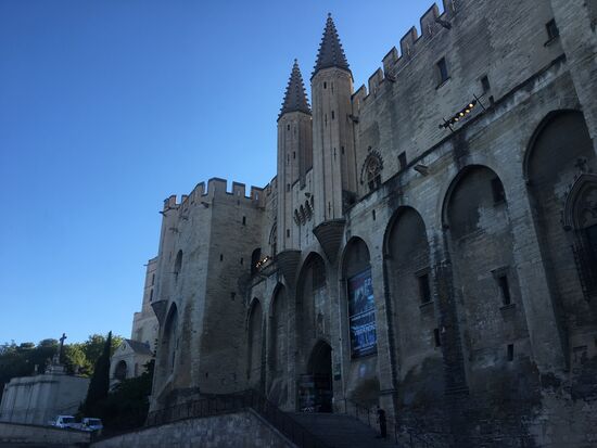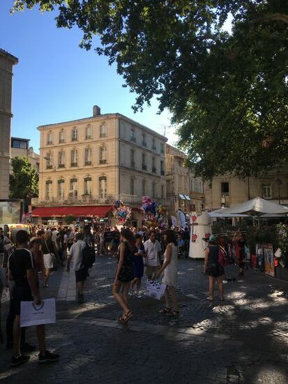 Dann führt der EV direkt durch das Zentrum von Avignon, doch schon nach wenigen Metern wird uns klar, dass das ein unmögliches Unterfangen ist. Einen Tag vor dem französischen Nationalfeiertag und mitten während des Theaterfestivals ist die Stadt proppenvoll und überall feiern die Franzosen ausgelassen, getreu dem Motto Freiheit, Gleichheit, Brüderlichkeit. Auf der Rue de la République tummeln sich Jongleure, Akrobaten, Sänger, Maler und allerlei künstlerisch ambitionierte Personen in teils illustre gekleideten Kostümen. Eine zutiefst fröhliche Atmosphäre, bei der ich die Franzosen für ihre in diesem Moment vorhandene Zufriedenheit und Freude des Seins bewundere. Am Place de l’Horloge tanken wir in diesem Tumult kräftig die verbrannten Kalorien des Tages auf.