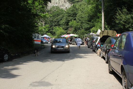 Da es gerade Mittagszeit war, parkten wir hier unser Auto am Strassenrand und gingen zu den vielen kleinen, bunten Ständen, um zu sehen, was Einheimische anboten. An einem Stand aßen wir zu Mittag. Es gab Döner mit Pommes. Auch konnte man hier eine Bootstour durch das Nadelöhr der Donau buchen. Viele kleine Boote fuhren die Touristen durch die engste Stelle der Donau.