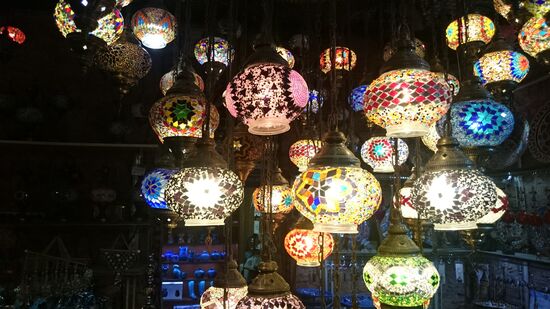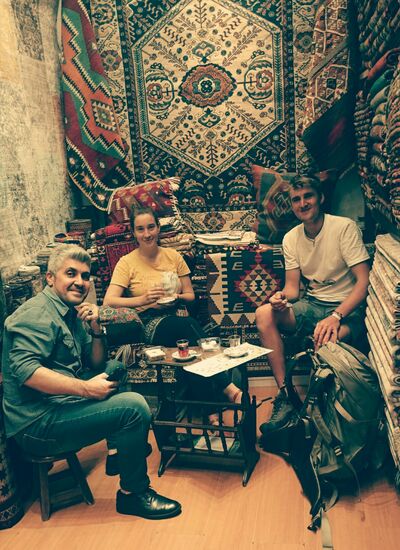 Durch die Marktgassen, in denen vor allem Kleidung und gefälschte Markentaschen angeboten werden, bahnen wir uns einen Weg hinauf bis zum Kapalı Çarşı, dem Großen Basar aus dem 15. Jahrhundert, mitten im Herzen der Altstadt - meinem Lieblingsort, an dem ich mich gar nicht satt sehen kann! Ben ist zum ersten Mal hier und ihm geht es genauso. Der von einem alten, bunt bemalten Gewölbe überdachte Markt erstreckt sich laut Recherche auf über 31.000 Quadratmetern Fläche und beherrbergt rund 4000 winziger Geschäfte. Den schönen bunten Dingen folgend irren wir entzückt von der ganzen Pracht der Gewürze, Blumentees, in Pistazien gewälzten Süßigkeiten, matt leuchtenden Mosaiklampen, handbemalten Keramiken und gold schimmernden Schmuckgeschäften durch die Gänge bis wir schließlich von einem Teppichhändler hereingebeten werden, der sich als George Clooney vorstellt, weil er ein kleines bisschen so aussieht, und uns auf einen Apfeltee sowie einen türkischen Nachtisch einlädt. Es sei okay, wenn wir nichts kaufen; er wolle sich nur gerne etwas unterhalten, weil er sonst zu viel rauche. Wir sitzen also über eine Stunde auf Hockern zwischen den wunderschönen handgemachten und bis unter die Decke gestapelten Teppichen und erfahren alles mögliche über den Teppichhandel, den Niedergang des aktuellen Regimes, den Besuch Bill Clintons und später George Bushs auf dem Basar, über seine eigene weltoffene Einstellung und sein Vertauen in gutes Karma. Es ist eine sehr originelle Begegnung, die wir noch lange in positiver Erinnerung behalten werden.