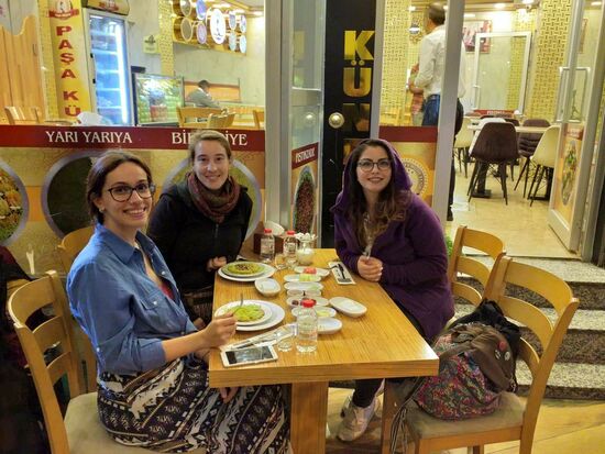 Am nächsten Tag treffe ich noch einmal Elif. Wir laufen über das von Security kontrollierte Unigelände hinunter zum Bosporusufer, besuchen das edle Sakıp Sabancı Museum, in dem wir uns die Kunst- und Kalligraphiesammlung des 2004 verstorbenen Großunternehmers und Philantrophen Sabancı ansehen, und fahren zum Abendessen zusammen zu Yağmur. Diese wartet nicht nur mit gefüllten Weinblättern auf uns, sondern ist auch gerade dabei, mir ein üppiges Überlebenspaket für die Fahrt zusammenzustellen, das neben Nahrung auch Socken, ein kleines Handtuch und weitere Andenken enthält. Ich soll sie nicht vergessen und unbedingt wiederkommen. Obendrein besteht sie darauf, uns noch um die Ecke zum Künefe essen einzuladen (mit Teigfäden, Butterschmalz und Sirup überbackener Mozzarella - zum Niederknien!).