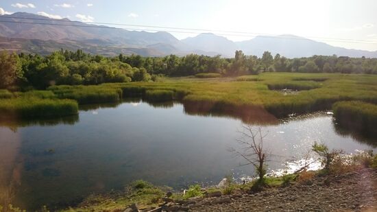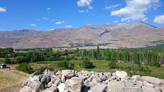 Die Landschaft Ostanatoliens sieht aus, wie in einem Bilderbuch. Für etliche Stunden fahren wir parallel zum Fluss durch ein viele Kilometer breites Tal, das auf beiden Seiten von hohen rötlich-felsigen Bergketten eingerahmt ist. Das Tal ist grün und vor allem Pappeln, Weiden und Obstbäume wachsen hier. Am Fenster ziehen Wiesen, Felder, große Rinderherden und Szenen idyllischer Landwirtschaft vorbei.