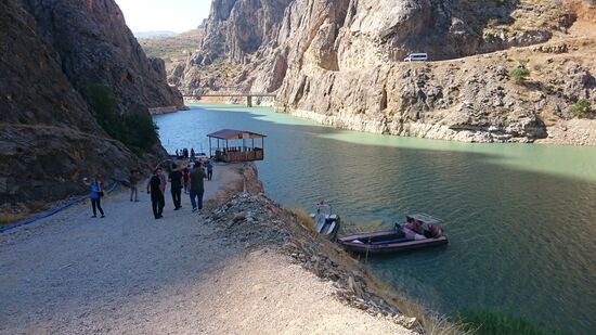 Die Tour ist exklusiv für die Passagiere des Zuges (überwiegend türkische Touris) und der Preis erscheint mir zumindest für deutsche Verhältnisse angemessen. So richtig pauschaltouristisch werden wir etwa 45 Minuten durch die trockenen Berge bis zum türkisfarbenden Fluss Euphrat gekarrt.