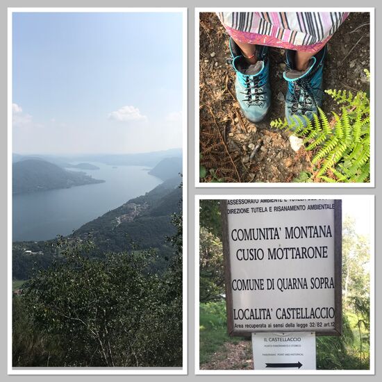 Und als ich dann da so fuhr, viel mir ein, das ich im Reiseführer gelesen habe, dass es in der Nähe einen Aussichtspunkt über den gesamten See auf 900 m Höhe gibt. Mit Straßenschildern nicht gefunden, denn ich hatte nach Quarno Sotto und Sopra geschaut. Die Beschilderung lautet nur auf Quarno, wie ich jetzt weiß. Aber ein bisschen wusste mein Navi und es führte mich dann 8 km schmalen Weges in steilen Serpentinen in die beiden Orte! Schön, das mit einem kleinen Fiat 500 machen zu können! Je größer das Auto, desto unangenehmer zu fahren. Nun ja, das Navi führte mich auch durch den Ort Quarna Sopra, hinein ins Zentrum. Wären keine Garagentore an einigen Häusern gewesen, hätte ich Zweifel gehabt, das ich überhaupt durch diese schmalen Gassen fahren darf. Und es kam, wie es kommen musste.... plötzlich stand ich vor der Zona Traffico Limitato (ZTL), in der du als Unberechtigter nicht rein fahren darfst, ansonsten eine sehr hohe Geldbuße droht, auch als Ortsfremder. Und liebevoll säuselte mir mein Navi ins Ohr, bitte wenden, wenn möglich! Man bekommt Mordgedanken..... Betonung auf „wenn möglich“ Leider habe ich oben auf dem Dach keine Hubschrauberrotoren, die mich grade hoch in die Luft bringen, wo Platz zum wenden wäre. Diese schmale Gasse Zentimeter für Zentimeter zurück und an der einzigen Einbuchtung kam dann ein Fahrzeug von unten und wir arbeiteten uns dann langsam aneinander vorbei, bevor es wieder etwas entspannter vorwärtsfahrend aus dem Ortskern rausging. Ich habe dann selbst wieder die Schilder zum Monte Castellacio gesucht und gefunden. Man durfte mit dem Auto fahren, es wurde immer schmaler und plötzlich nur noch Schotterpiste durch den Wald! Da konnte man aber das Auto abstellen. Tja und ich wollte ja nur einkaufen, also hatte ich Sommerkleidchen und Flip Flops an.... manchmal trabe ich ja mit einer gewissen Unüberlegtheit durch die Welt! Aber es waren noch die Wanderschuhe im Auto, komisches Gefühl ohne Socken, aber besser als anders. Es ging durch den Wald über Stock und Stein und dann ein schmaler Weg durch ein Farnfeld voll mit Heuschrecken, Echsen und Schmetterlingen. Gab es da vielleicht auch Schlangen? Nein keine gesehen.... es war schon eine lustige Kombi... Sommerkleidchen, dicke Wanderschuhe und keinen Plan von nix. Ich bin einfach mal gelaufen und plötzlich tat sich das Panorama immer mehr auf..... der ganze Lago d‘ Orta lag mir zu Füßen! Welch ein Ausblick und viel schöner als einkaufen!