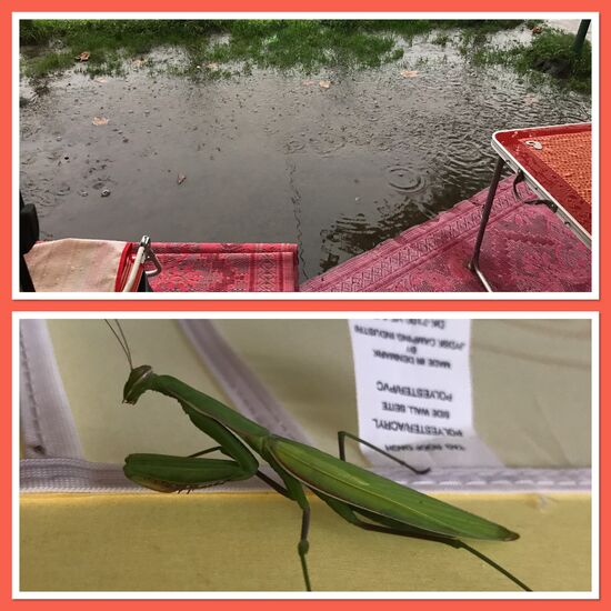 Um 6 Uhr durch donnern wachgeworden und dann war ich beschäftigt, trotz Sonnensegel die darunter befindlichen Sachen, vor allen Dingen der Grill, nicht noch nasser werden zu lassen. Es hat bis mittags ununterbrochen geschüttet und mich hat es gewundert, das die Enten vom See nicht auch über meine Parzelle geschwommen sind. Dafür hatte ich, selbst noch am Abend, eine Gottesanbeterin zu Besuch!
