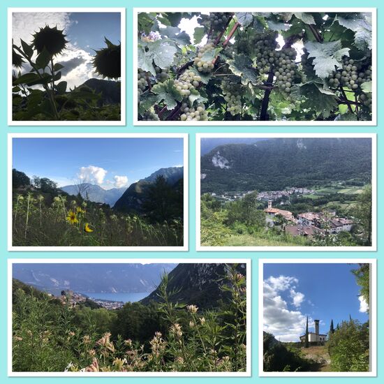 Geplant habe ich eine Wanderung von Varone (Wasserfall Grotten Varone) zum Lago di Tenno. Normalerweise eine Wanderung von 2- 21/2 Std. Das Ziel sollte mit Picknick und einem schönen Bad im See locken. Man fährt oberhalb von den Cascata del Varone rechts auf den Parkpkatz (nicht der vom Wasserfall, der ist zeitlich begrenzt, sondern ein kurzes Stück höher rechts in die Via 24 Maggio. Der Parkplatz ist ausgeschildert. Genau gegenüber dieser Straße am Ristorante/ Albergo La Rochetta beginnt der Einstieg „Sentiero di gola Tenno“. Dieser führt idyllisch erst geteert dann auf alten Steinpfaden zwischen den Terrassen des Olivenhains und Weintrauben stetig nach oben Richtung Tenno. Zum Schluss geht man eng an der Felswand durch einen Wald und kommt oben am Castello raus. Hier lohnt ein kleiner kurzer Rundgang durch das Dorf linker Hand und ein Besuch der so idyllisch gelegenen Kapelle San Lorenzo mit wundervoller Aussicht auf Riva del Garda und dem See! Auf dem ganzen Weg lohnt es, sich immer mal wieder umzudrehen und die Aussicht zu genießen! Und dann traf ich Liliana! Schöne Grüße von Liliana an Deutschland! Sie ist 77, spricht recht gut deutsch, die Mama kam aus Innsbruck, sie hat keine Zähne, schneidet das Fleisch immer klein und isst langsam... ihr Mann ist uralt und den ganzen Tag am reden, das nervt sie, deshalb freut sie sich, wenn jemand im Dorf ist und sie sich unterhalten kann. Nachdem ich dann gefragt wurde, woher und wohin des Weges und warum allein, habe ich die Chance genutzt und nach dem Weg nach Canale gefragt, da ich von dem Wanderführer nicht ganz so sicher war. Da lacht mich Isabella geheimnisvoll an und meint nur, es führen ganz viele Wege abseits der Straße nach oben... lies die Schilder und du wirst deinen Weg finden! Hhhmmhhmmm, mit dieser Antwort habe ich ja nun nicht wirklich gerechnet. Ich musste Richtung Calvola/ Canale. Ich fand ein Schild rechterhand des Dorfes auf der anderen Strassenseite und tatsächlich führte es mich Richtung Calvola. Und es war wie beschrieben eine rot/weiße Wegmarkierung. Und an der entscheidenden Stelle (wie ich aber erst 2 Stunden, einige Kilometer und ganz viel bergauf später feststellte) bin ich auf dem Weg 401 geblieben, Richtung Calino... hört sich doch fast an wie Calvola. Zumindest die ersten 3 Buchstaben! Und der Weg passte auch zunächst auf die Beschreibung des Wanderführers. Also voll verlaufen! Aber der Weg war wunderschön! Zwischen alten efeuberankten Steinmauern begleitet von Schmetterlingen, Echsen und Unmengen an Grashüpfern ging es zwischen Oliven und Weinreben immer weiter hoch! Am Wegesrand waren Alpenveilchen, Herbstzeitlose und verblühte Sonnenblumen und der Schweiß lief in Strömen.... nun ja und oben Richtung Refugium Sankt Pietro dämmerte es mir, das ich mal ganz falsch war. Kein Schild Canale, kein Schild Laga di Tenno. Google Maps kennt keine Wanderwege und wollte mich auf der Straße wieder runter schicken. Also wieder runter nach Tenno... eigentlich wollte ich schon frustriert wieder zum Auto, das verlaufen hat mich fast 2 Stunden gekostet... aber ich bin ja ein Dickkopf! Ich wollte meine Crostata am See essen und ich wollte im See schwimmen. Also 2. Versuch und diesmal bin ich richtig gelaufen und war auch gar nicht mehr so extrem steil! Wie ich dann feststellte, gibt es mehrere Wege, die rot-weiß markiert sind! Und ich muss sagen, es hat sich gelohnt. Der See ist so Türkis, so wundervoll, dass einem das Herz aufgeht, in dem Moment, wo man den ersten Blick erhascht! Dort schmeckte die Crostata wundervoll und das Bad.... zumindest bis zum Popo (so kalt), habe ich auch noch genommen. Es war herrlich, schade das ich hier nicht länger bleiben konnte. Und das Dorf Canale ist wie aus dem Mittelalter, wie zurück in eine andere Vergangenheit. Ein Bus fuhr nicht mehr runter, also auch den Abstieg zu Fuß! Aber man kannte ja jetzt den Weg. Und was soll ich sagen.... mein Knie meldete sich und sagte: meinst du, der Schmerz hat sich zwischen Österreich und Italien in Luft aufgelöst? Super, humpelt mit Aua-Füßen kam ich nach 1 Stunde am Auto an. Zur Dämmerung am See entlang kam Pavarotti in den USB-Anschluss und es war ein schönes Ende von einem traumhaften Tag, der nicht ganz glatt gelaufen ist.