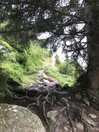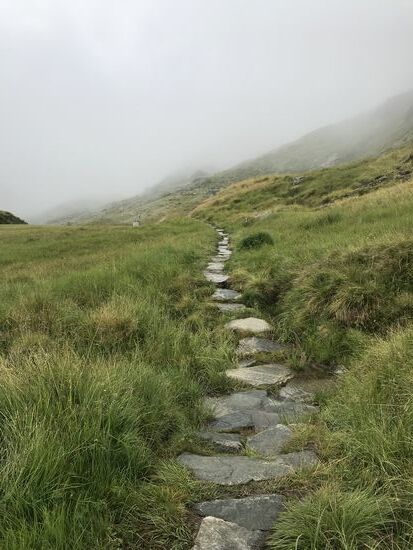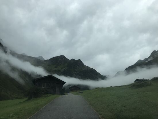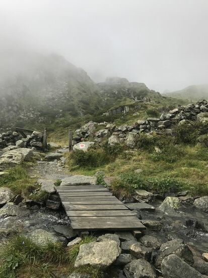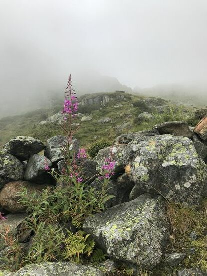 Gestartet bin ich auf 1.600 m, in nebelverhangenen Regen. Der Regenponcho ist im Dauereinsatz. Der Aufstieg lässt die schöne Landschaft immer nur vermuten, wenn an kleinen Stellen der Nebel sich lichtete. Begleitet wurde ich mit Kuhgeläut und dem Rauschen vom Alpeiner Bach. Und ich war eigentlich gar nicht traurig um das Wetter.... selbst bei schlechten Wetter gibt mir diese Landschaft soviel!