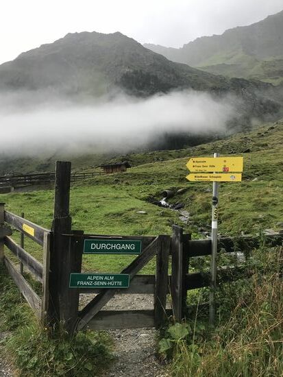 Es ist schon schwer, sich im dicht verhangenen Tal zu motivieren und erst recht, wenn pünktlich beim Schuhe zu binden wieder der Regen beginnt. Aber ich hatte mir vorgenommen, zur Franz Senn Hütte zu wandern, also blieb es auch dabei. Los ging es vom Parkplatz Oberiss! Hätte mir das ein Einheimischer nicht gesagt, hätte ich mich nicht getraut, bis dahin mit dem Auto zu fahren.... schmale Straße durch Almgebiet, einfach nur wunderschön ..wo die Tiere in jedem Fall Vorrang haben!