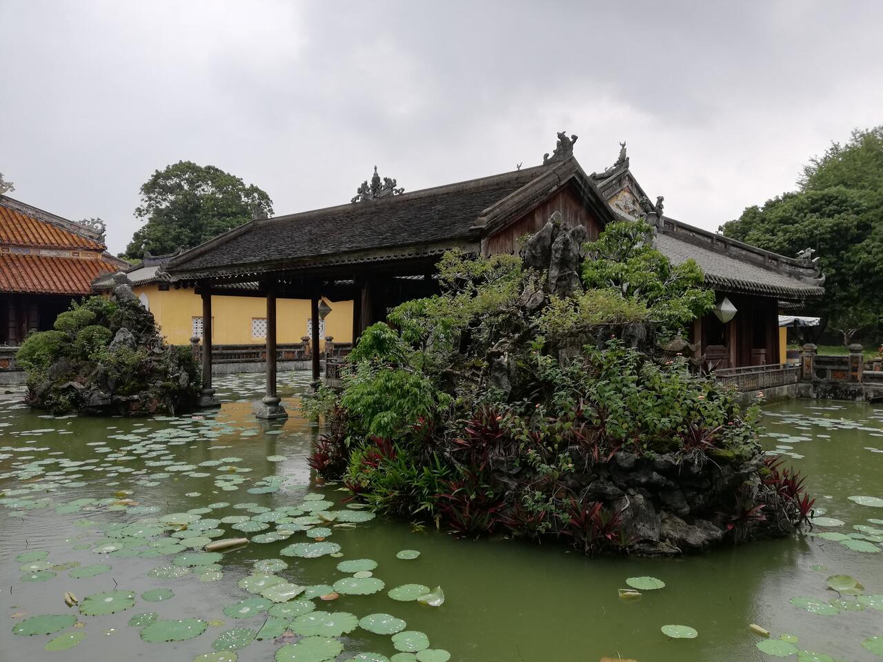 Die Stadt Hue ist DER Zwischenstop so ziemlich jeder Vietnamreise. Ob von Nord nach Süd oder andersherum, aufgrund der langgezogenen Form des Landes kommt man gar nicht daran vorbei. Hue war in vergangener Zeit Königssitz von Vietnam. Aus diesem Grund findet sich hier eine ganze Menge sehenswerter Relikte aus diesen Tagen, wie Grabanlagen, Pagoden und einer zentralen Zitadelle, die den Palast und den Hofstaat beheimateten. Das ganze liegt entlang des Flusses mit dem klangvollen Namen Perfume River, der durch die Stadt Hue fließt und rund zehn Kilometer flussaufwärts in das Südchinesische Meer mündet. Über unser Hostel buchten wir uns eine (Achtung!) private Bootsfahrt zu drei dieser Sehenswürdigkeiten. Wir wurden also für rund vier Stunden auf einem länglichen Motorboot, das nur für uns zwei eindeutig mindestens zwei Nummern zu groß war, über den Fluss geschippert und besuchten nach einander eine royale Grabanlage aus dem 19. Jahrhundert, eine buddhistische Pagode und die erwähnte Zitadelle. An dieser ließen wir uns einige Stunden Zeit. Alles in allem war das schon sehr sehenswert. In Vietnam definitiv die schönsten historischen Sehenswürdigkeiten. Leider waren wir hier in Zentralvietnam mitten in die Regenzeit geraten, was bedeutet, dass es spätestens am Nachmittag anfing zu regnen. Damit sind alle Unternehmungen unter freiem Himmel natürlich nur noch halb so schön und wir sahen zu, dass wir ins Trockene kommen.