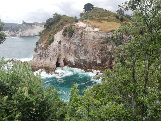 Am ersten Tag auf der Halbinsel fuhren wir an deren Ostküste zu dem Dorf Hahei, einem kleinen Ferienort mit schönen Aussichtspunkten und einer kleinen Wanderung zu einem der Highlights der Region: der Cathedral Cove. Tatsächlich war hier vergleichsweise viel los. So viel, wie wir es kaum ein zweites Mal an vergleichbaren Orten in unseren viereinhalb Wochen Neuseeland erlebten. Die Cove (zu deutsch: Brandungsnische) war aber auch sehr spektakulär und so wunderte uns die Ansammlung an Touristen nicht weiter. Auf dem Rückweg zum Auto wurden wir dann eiskalt erwischt. Und zwar von einem Platzregen, der uns innerhalb weniger Minuten bis auf die Unterhose durchweichte. Pitschnass und frierend liefen wir zurück zum Auto und fuhren zu unserer Unterkunft zurück.