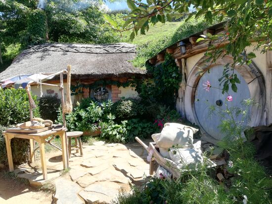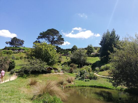 Das Filmset ist nur über eine gebuchte Tour zu besuchen, die einen in Gruppen mittlerer Größe für rund anderthalb Stunden durch die malerischen Hügel Hobbitons führt. Wir waren auf jeden Fall sofort im Modus und genossen jeden Augenblick in dieser malerischen Umgebung. Über vierzig Hobbithöhlen, zahlreiche Gärten und Terrässchen, der Baum, unter dem Bilbo seine berühmte Rede hält ("Ich kenne die Hälfte von euch nicht halb so gut, wie ich es gern möchte, und ich mag weniger als die Hälfte von euch auch nur halb so gern, wie ihr es verdient.") und nicht zuletzt die Schenke namens Zum Grünen Drachen. Alles war absolut authentisch in Stand gehalten und einfach herrlich anzusehen. Fast erwarteten wir, dass aus einer der Hobbithöhlen jeden Moment einer seiner Bewohner auf den Weg purzelt. Das geschah allerdings erstaunlicherweise nicht. Das schöne in Neuseeland ist, dass hier alles ein paar Nummern kleiner und familiärer ist als in Europa oder Asien. Und so haben sie es auch hier toll geschafft, trotz vieler hundert Besucher pro Tag die verträumte Auenland-Stimmung zu bewahren.