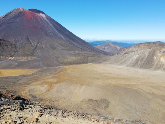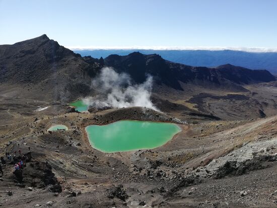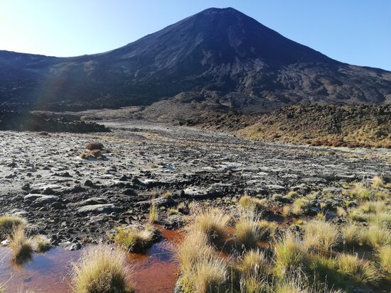 Naja, nachdem ich die Eiszapfen abgeschlagen hatte, konnten wir loslaufen und wir merkten sofort, dass es eine gute Entscheidung gewesen war, hierher zu kommen. Die Szenerie war einfach atemberaubend. Die Sonne ging langsam über den mit Raureif bedeckten Bergen auf und wir stapften stetig entlang eines breit ausgetretenen Pfades. Die erste Hälfte des Weges verlief fast ausschließlich bergauf immer mit einem ausgezeichneten Blick auf den Mount Ngauruhoe, der als Schicksalsberg Mittelerdes Berühmtheit erlangt hatte. Spätestens an der höchsten Stelle und beim darauffolgenden Abstieg fiel uns das auf, was wir zuvor schon gehört und gelesen hatten: Dieser Weg ist eine Autobahn. Schätzungsweise 2000 Wanderer waren an diesem Tag mit uns hier unterwegs. Leider nahm das der majestätischen Landschaft ein wenig seinen Zauber, doch wir ließen uns nicht zu sehr beirren. Nach einem schier endlosen Abstieg erreichten wir am Nachmittag wieder unser Auto und fuhren zurück zu unserer Unterkunft