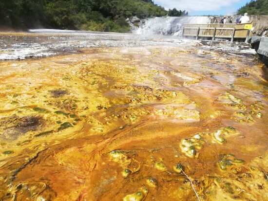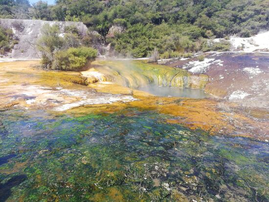 Ein letztes Mal Thermal-Action! Wieder ging es auf die Nordseite des Sees bis wir fast in Rotorua waren, als von der Hauptstraße rechts ein schmales Sträßchen durch liebliches Farmland und dichten Wald abzweigte und uns zu dem Geothermalpark Orakei Korako führte. Wenn der Geruch von fauligen Eiern in der Luft liegt, weiß man, dass man richtig ist. Wir nahmen eine kleine Fähre über den Fluss Waikato und fanden uns dann inmitten zahlreicher blubbernder Quellen und Geysiren. Die Stimmung hier war wirklich wie aus einer anderen Welt mit den knallgelben Schwefelablagerungen, den türkisen Pools und den stetig aufsteigenden Dampfschwaden. Und obendrauf hatten wir die Umgebung fast für uns allein.