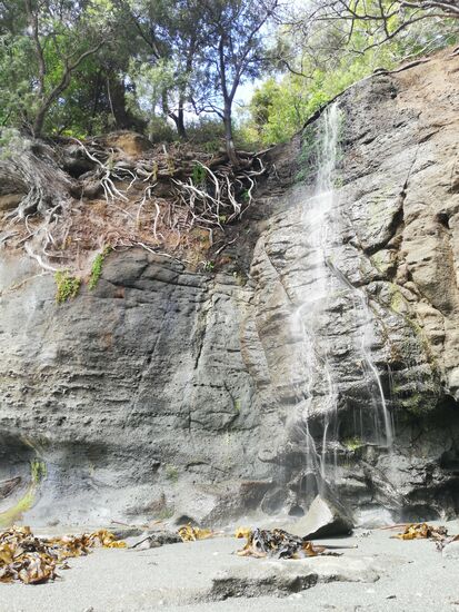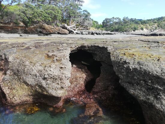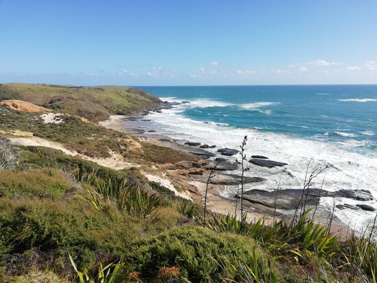 Aber auch wenn unsere Unterkunft es uns nicht gerade leicht machte, so wollten wir doch noch etwas von der Umgebung sehen. Wir entschlossen uns also zu einer rund fünf Kilometer langen Küstenwanderung in der Nähe, dem Mangawhai Cliff Walk. Bei diesem läuft man auf den Klippen in die eine Richtung und nach einem Abstieg hinunter zum Meer am Strand entlang zurück. Für den Rückweg ist allerdings ein niedriger Pegelstand vonnöten, da ansonsten Teile unter Wasser stehen. Wir passten unsere Wanderung dementsprechend an und konnten so diesen wunderschönen Küstenstreifen bestaunen. Obwohl es zwischenzeitig ziemlich anfing zu regnen, genossen wir diese Tour sehr.