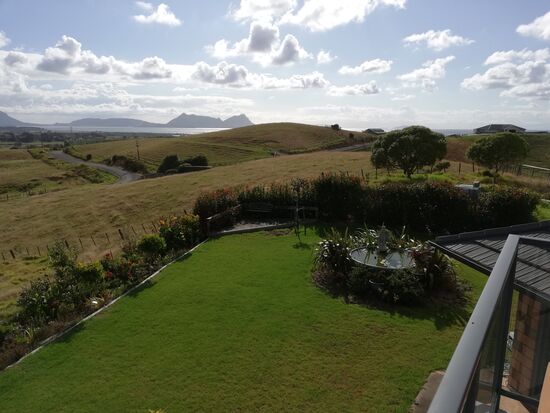 Ein letztes Mal muss ich in die Superlativen-Schublade greifen, um unsere Unterkunft in Ruakaka zu beschreiben, denn es ist einfach unfassbar, in welchen Lagen manche Neuseeländer ihr Haus stehen haben und glückliche Touristen wie uns daran teilhaben lassen. Und in diesem Fall war es einfach atemberaubend. Inmitten von hügeligem Weideland, ein paar hundert Meter von der Hauptstraße entfernt, stand das Wohnhaus unserer Gastgeber Brian und Heather. Beide gut über siebzig hatten sich für ihren Lebensabend in die Abgeschiedenheit seiner Heimat zurückgezogen. Ihr Haus, die Hawk Heights, überblickt die gesamte Umgebung, in einiger Entfernung ist sogar das Meer zu sehen. Aber der absolute Hammer war, dass das einzige Zimmer, das sich im ersten Obergeschoss befindet, unser Gästezimmer war. Hier hatten wir vielleicht die tollste Aussicht von unserem Nachtlager der gesamten Reise (vielleicht mit Ausnahme von der Nacht im Baumhaus im Urwald von Laos).